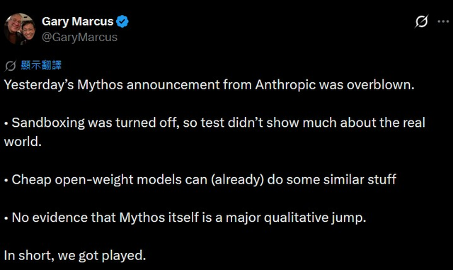 杨立昆在技术观点上的老对手、AI批评家、大模型怀疑论者、纽约大学教授加里·马库斯,今日凌晨的措辞稍温和些:“Mythos的炒作大部分是神话迷思(The Mythos stuff was mostly a myth)……攻破火狐浏览器时,浏览器的沙箱被关闭了。其他功能能被廉价的开放权重模型实现。没有证据证明Mythos本身是质变飞跃。简单讲,大家被耍了”。