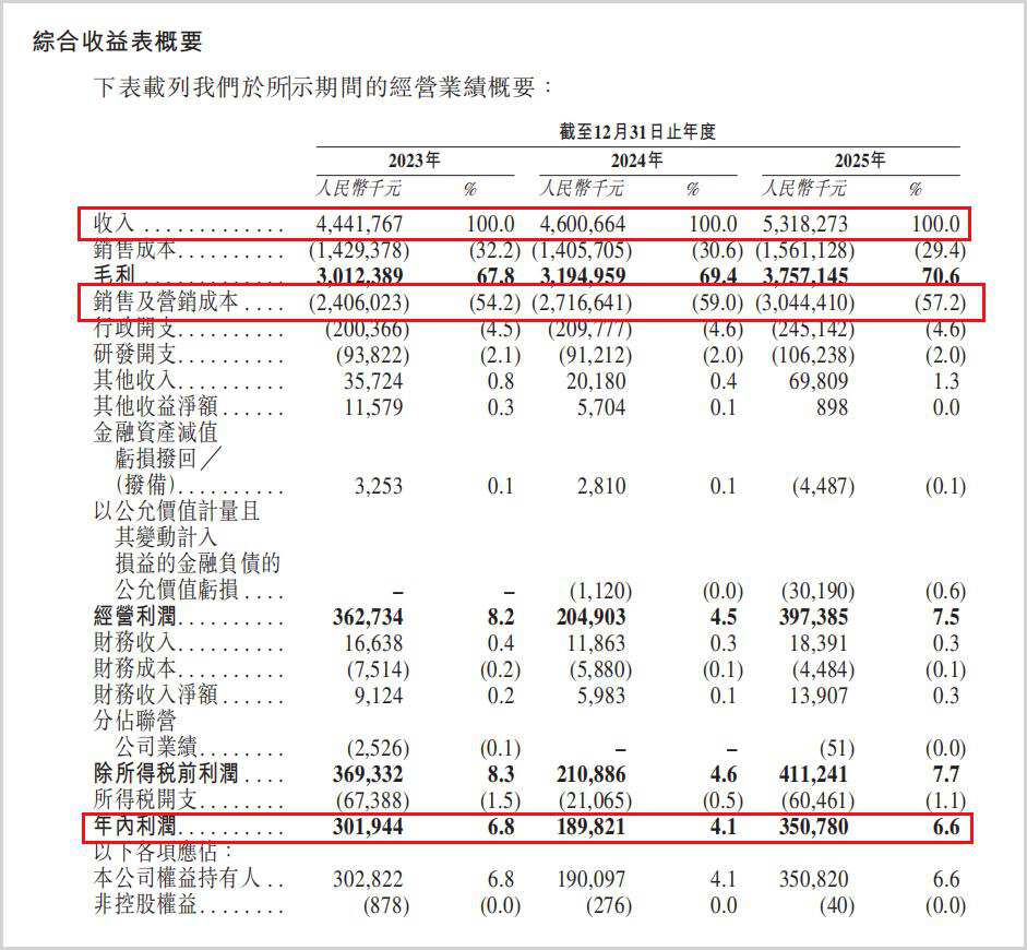 利润剧烈波动的核心矛盾直指持续高企的销售及营销成本。该费用占营收比例常年维持在54%至59%的高位,三年累计超过80亿元。其中,营销及推广开支的增速尤为惊人,从2023年的17.20亿元激增至2025年的23.81亿元,两年增长38.4%,远超销售费用整体增速,成为侵蚀利润的主要推手。