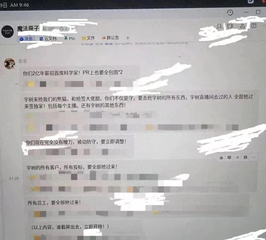 4月10日,一张内部群聊截图在社交平台流传,将俞浩再次推上舆论风口。截图显示,其在公司内部群中以强硬语气要求团队对宇树科技展开“全面围攻”,不仅提出“2亿年薪招首席科学家”,还要求在客户、员工、主播等层面实现“全面抢夺”,甚至直言“宇树的所有资源都要抢过来”。