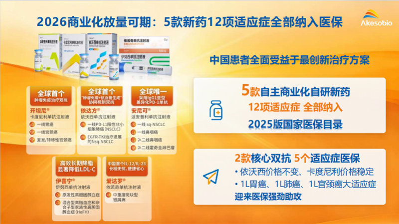 2025年底,康方5款产品的12个适应症在医保谈判中全部纳入目录,其中卡度尼利的一线胃癌、一线宫颈癌,以及依沃西的PD-L1阳性一线肺癌等适应症均成功新增纳入国家医保,且核心双抗卡度尼利和依沃西新增适应症的价格相比2025年保持了相对稳定。这些因素的叠加,有望推动康方迎来新一轮销售放量的“加速度”。