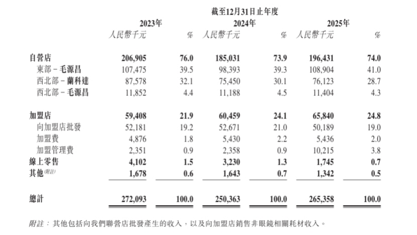 从业务结构看,毛源昌眼镜对单一品类和线下渠道依赖严重。2023年至2025年,其处方眼镜销售收入占比分别约为79.7%、80.1%、79.6%。2025年,毛源昌眼镜的自营店贡献74%的收入,加盟店贡献24.8%的收入,而线上零售占比为0.7%。