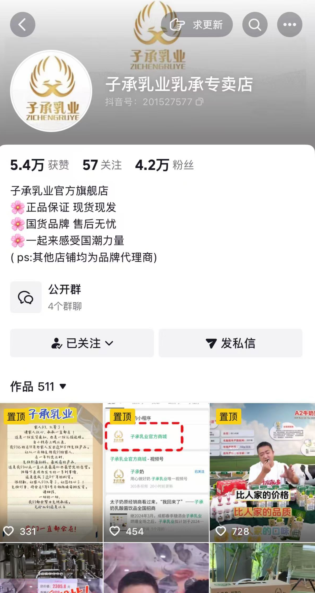 4月12日,红星资本局在抖音搜索发现,“子承乳业乳承专卖店”账号有4.6万粉丝,已于2025年9月底停止更新,店铺橱窗疑似关闭。子承乳业董事长李帅的个人账号有24.5万粉丝,2025年10月18日后也不再更新。