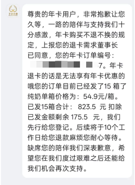 有着相同遭遇的还有安徽合肥的陈女士(化名)。2025年8月,她也在直播间购买了“子承乳业”的年卡,但5个月后便停止了发货。当陈女士找到售后客服要求退款时,对方表示,退卡无法再享受年卡的优惠价格,需按原价54.9元/箱结算(约为优惠价的3倍)。扣除已发货的15箱,只能退给陈女士175元。