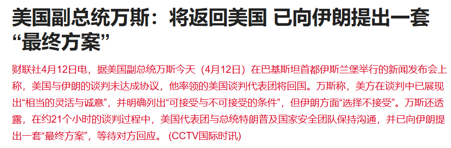 据报道,美国副总统万斯今天(4月12日)在巴基斯坦首都伊斯兰堡举行的新闻发布会上称,美国与伊朗的谈判未达成协议,他率领的美国谈判代表团将回国。万斯称,美方在谈判中已展现出“相当的灵活与诚意”,并明确列出“可接受与不可接受的条件”,但伊朗方面“选择不接受”。万斯还透露,在约21个小时的谈判过程中,美国代表团与总统特朗普及国家安全团队保持沟通,并已向伊朗提出一套“最终方案”,等待对方回应。