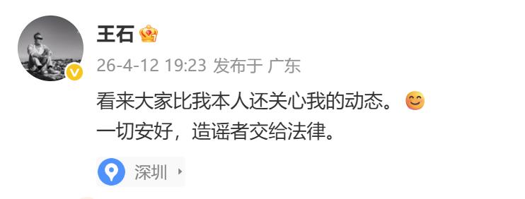 随后,王石本人也发文:“看来大家比我本人还关心我的动态。一切安好,造谣者交给法律。”,帖子最后的定位显示是深圳。