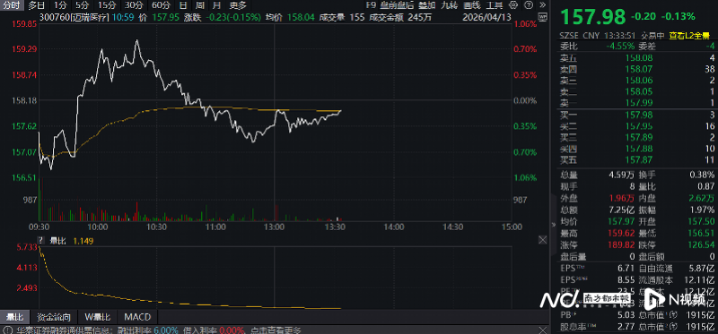 二级市场方面,半年来,迈瑞医疗股价跌幅已有三成,引起了投资者的广泛关注。截至4月13日记者发稿时,该司股价报157.98元,微跌0.13%,总市值逾1900亿。