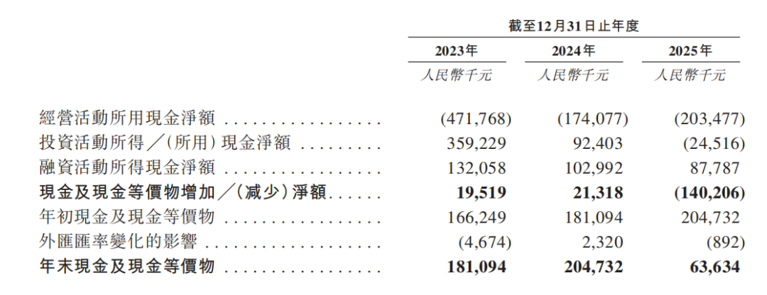 无法自我造血最直接的后果,就是公司的现金流变得极其脆弱。2023—2025年,公司经营现金流净额长期维持流出状态,2025年底的现金储备仅有6363.4万元,按照2025年4.6亿元的固定期间费用计算,自有现金储备仅够维持2~3个月的正常运营,因此公司发展极度依赖外部融资。