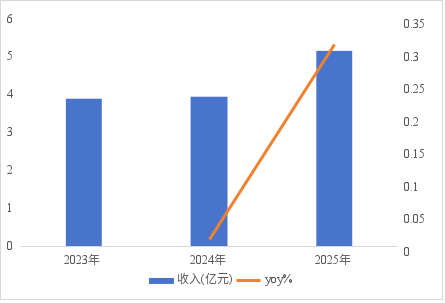 2023—2025年,公司营收分别为3.9亿元、3.94亿元和5.16亿元,CAGR15%。从变化趋势看,近三年公司整体收入表现并不算亮眼,尤其是2023—2024年,其收入几乎陷入停滞状态。但进入2025年,随着智能眼镜概念的再度爆火叠加公司新品迭代,推动公司收入上涨了31%,突破5亿元。