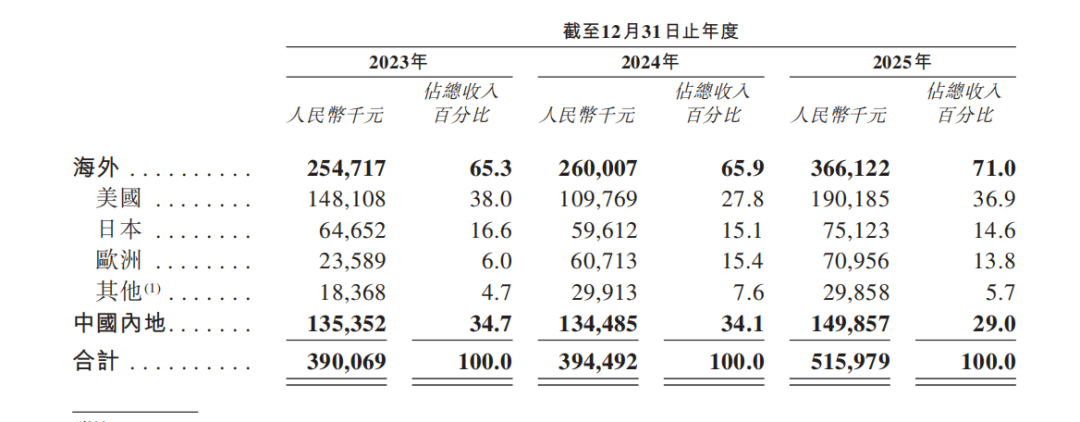 分区域看,目前公司超70%的收入来自海外市场,覆盖超40个国家和地区,其中美国为最主要的市场,2025年的收入占比约37%,其次为日本和欧洲,占比均在15%左右;2025年内地市场的收入占比为29%。