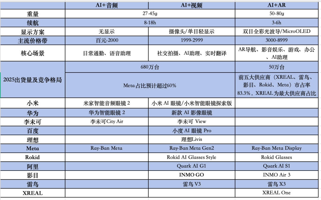 首先,从行业空间来看,根据Wellsenn XR的数据,全球智能眼镜出货量从2023年的24万台快速攀升至2025年的766万台,CAGR高达465%。虽然行业整体快速扩张,但目前供给端出现了明显的分层。