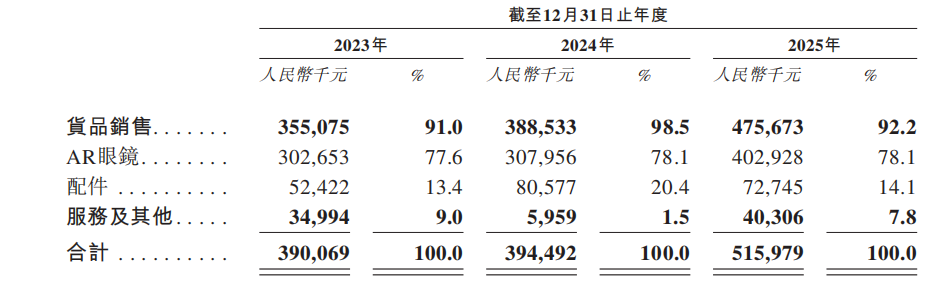 分产品类型看,AR眼镜是公司最核心的收入来源,根据招股书披露,2023—2025年,AR眼镜销售收入占比分别为77.6%、78.1%和78.1%。同时,以Beam系列、Eye、Hub为代表的配件占比在15%左右,综合看,硬件收入长期占公司总收入的90%以上,2025年占比达到92.2%。