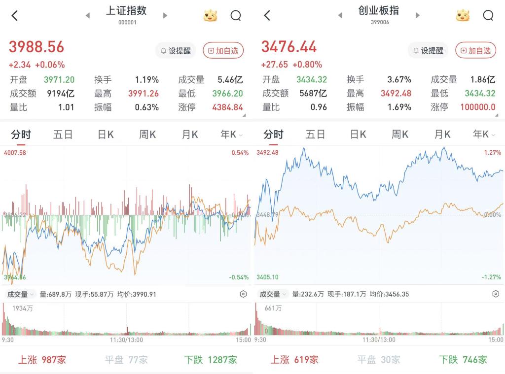 至收盘,上证综指涨0.06%,报3988.56点;深证成指涨0.69%,报14407.86点;创业板指涨0.8%,报3476.44点。