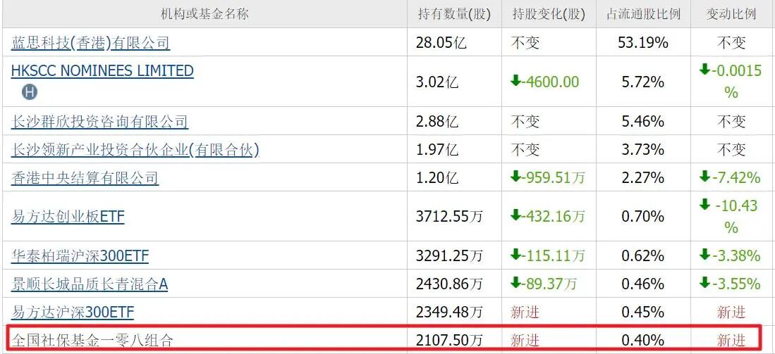 年报社保基金一零八组合新进2107万股,位列第十大流通股东。