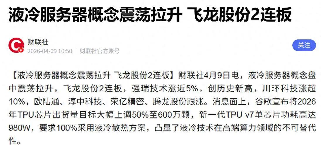 谷歌宣布将2025年TPU芯片出货量大幅上调50%,而这种新一代新高,功耗极高,要求100%采用液冷散热,直接提升了对液冷服务器的需求。相关个股也表现活跃。