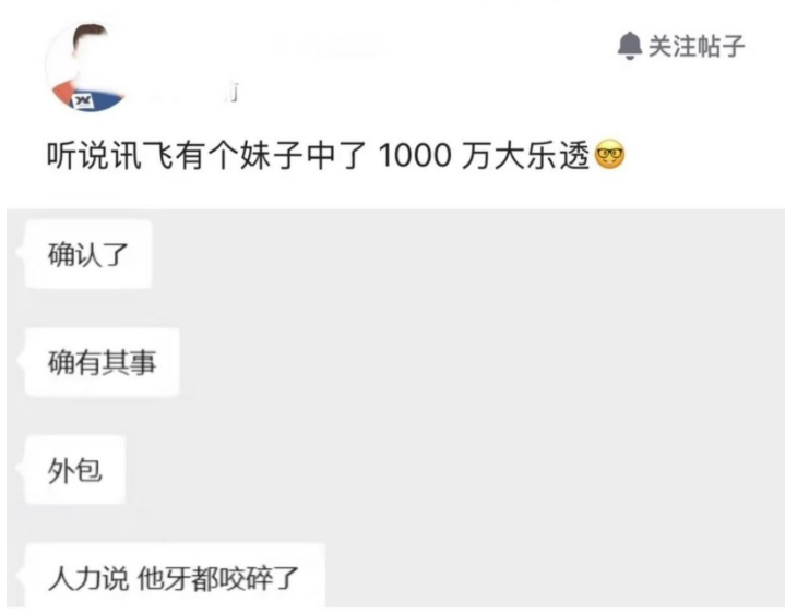 有科大讯飞的同事在社交网络平台表示,单位的一名女同事中了1000万彩票。 同时,下面评论附和道,“确认了,确有此事。 ” 还有评论补充道,“是真的,不过是1500万,我老公就是讯飞的,内部群已经传遍了。 中奖人连公司奖金都不要了,立马辞职走人了。 ”