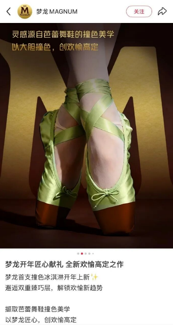 近日,不少网友注意到梦龙冰淇淋在某社交平台发布的一则开心果新品广告,其宣传物料中以“灵感源自芭蕾舞鞋的撞色美学”为主题,将芭蕾舞鞋的配色设计与冰淇淋外观关联。部分消费者认为这种联想令人不适,质疑内容涉嫌物化女性。话题“梦龙广告 芭蕾舞鞋”也在4月13日迅速登上热搜。