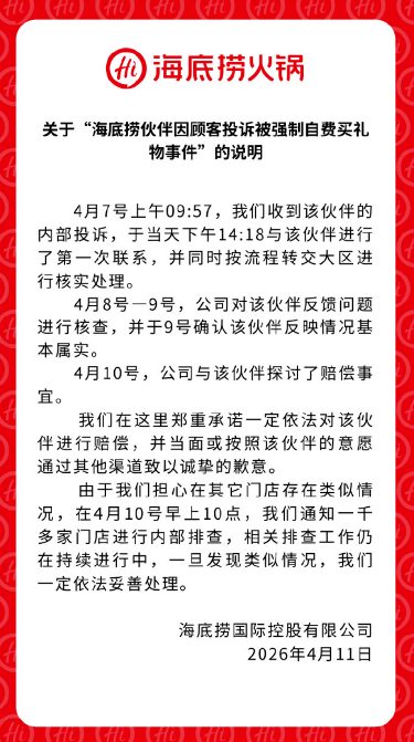 4月11日,海底捞火锅发布了关于“海底捞伙伴因顾客投诉被强制自费买礼物事件”的说明,表示“郑重承诺一定依法对该伙伴进行赔偿,并当面或按照该伙伴的意愿通过其他渠道致以诚挚的歉意。”