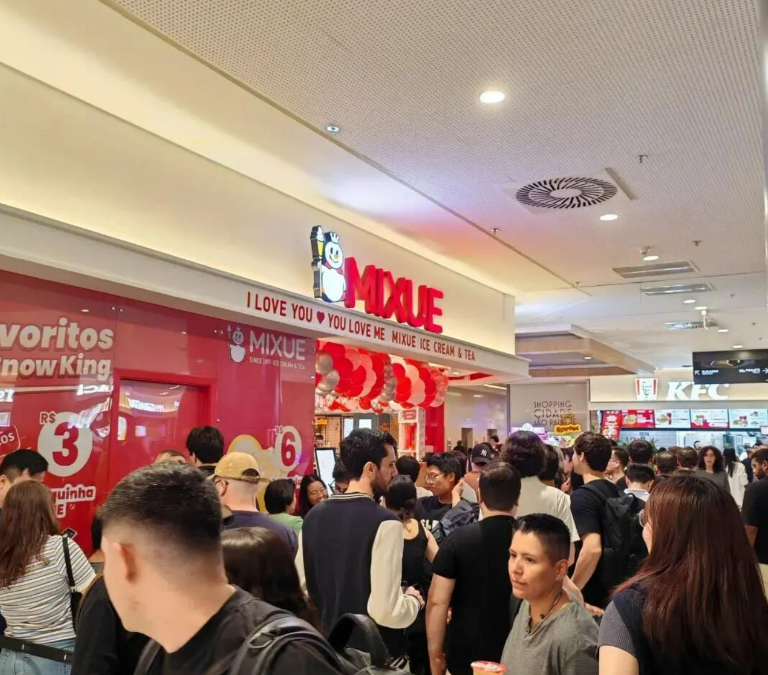 当地时间4月11日,蜜雪冰城南美首店暨巴西保利斯塔店在圣保罗城市购物中心开业,吸引大批民众前去排队购买。