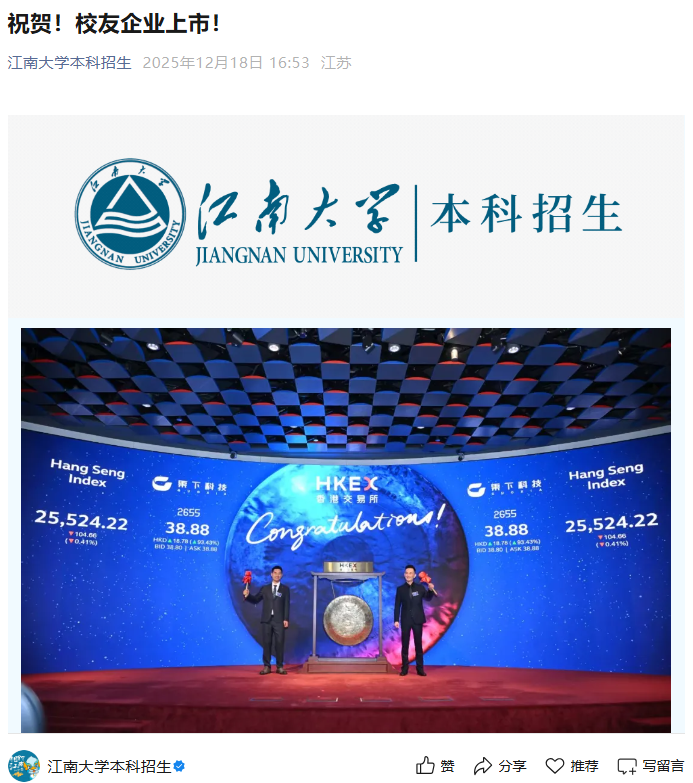 对此,江南大学也颇为自豪。在去年12月果下科技港股上市之时,“江南大学本科招生”微信官号就发布了祝贺文章。