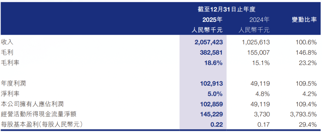 营业收入方面,2025年达到人民币20.57亿元,较2024年的人民币10.26亿元实现翻倍,增幅100.6%。
