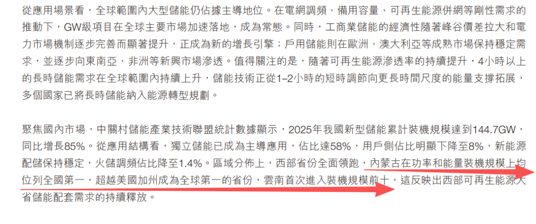 从国内市场来看,统计数据显示,2025年我国新型储能累计装机规模达到144.7GW,同比增长85%。区域分布上,西部省份全面领跑,内蒙古在功率和能量装机规模上均位列全国第一,超越美国加州成为全球第一的省份,云南首次进入装机规模前十。