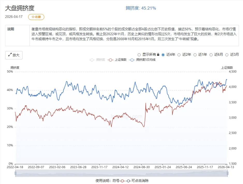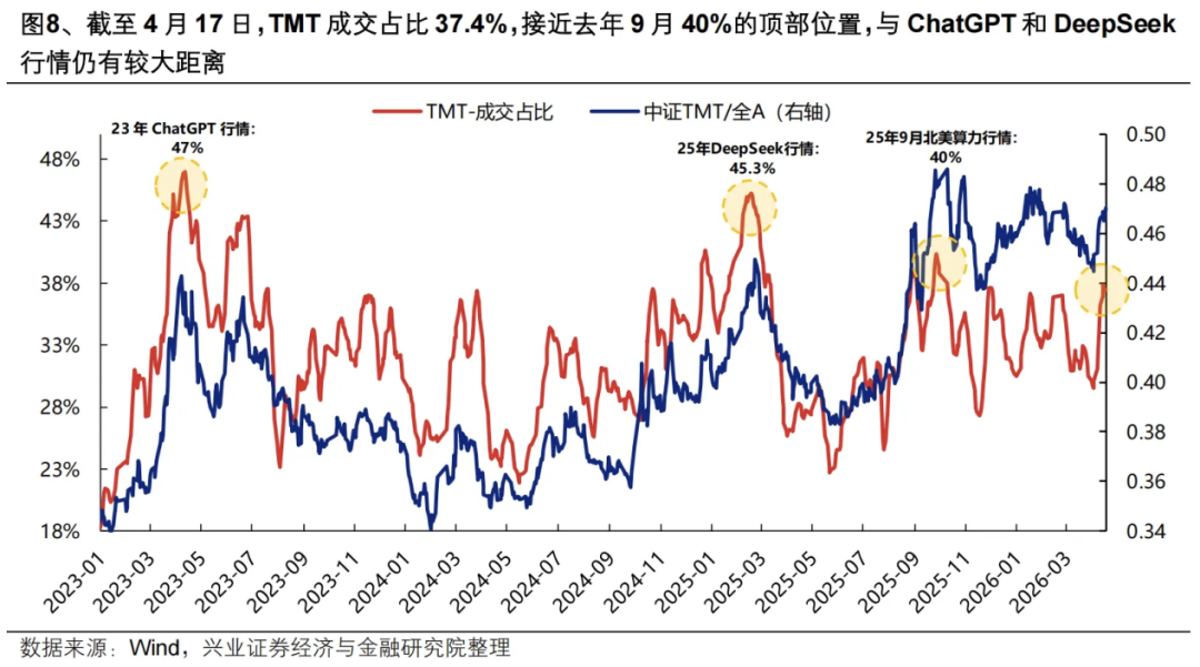 周末科技股拥挤度开始发酵,4月17日市场前5%个股成交占比达到45.21%,说明市场活跃资金都在抱团强势股票,历史上该值达到45%以上容易产生调整。另外TMT成交占比37.4%,接近去年9月40%的顶部位置,但与ChatGPT和Deepseek还有差距。