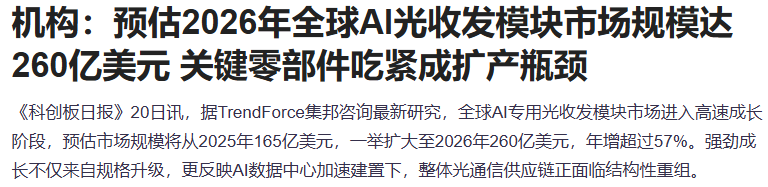 据TrendForce集邦咨询最新研究,全球AI专用光收发模块市场进入高速成长阶段,预估市场规模将从2025年165亿美元,一举扩大至2026年260亿美元,年增超过57%。