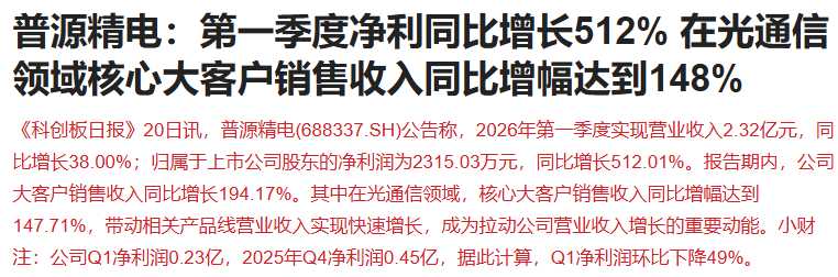 普源精电发布财报称2026年第一季度实现营业收入2.32亿元,同比增长38.00%;归属于上市公司股东的净利润为2315.03万元,同比增长512.01%。报告期内,公司大客户销售收入同比增长194.17%。其中在光通信领域,核心大客户销售收入同比增幅达到147.71%,带动相关产品线营业收入实现快速增长,成为拉动公司营业收入增长的重要动能。后续看是否有更多的公司印证光模块设备放量。
