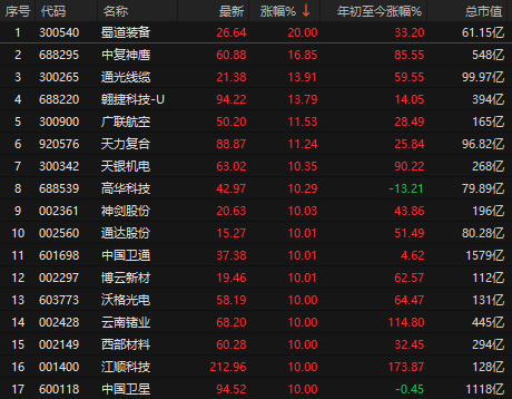 商业航天板块大爆发,天银机电、神剑股份、中国卫通、中国卫星、西部材料等数十只股票涨停。