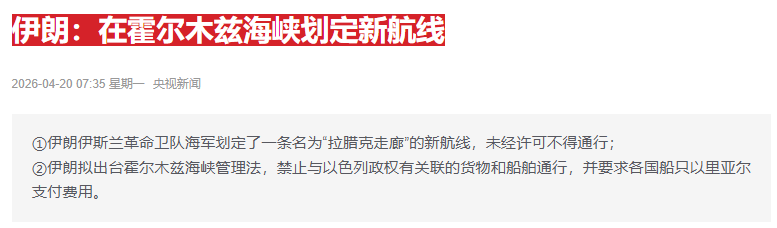 据报道,伊朗伊斯兰革命卫队海军已划定一条从霍尔木兹岛以南至拉腊克岛以南水域的新航线。据悉,该航线被命名为“拉腊克走廊”,未经革命卫队海军许可不得通行。