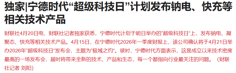 据报道,宁德时代计划于明日举办的“超级科技日”上,发布钠电、凝聚态、快充等相关技术产品。