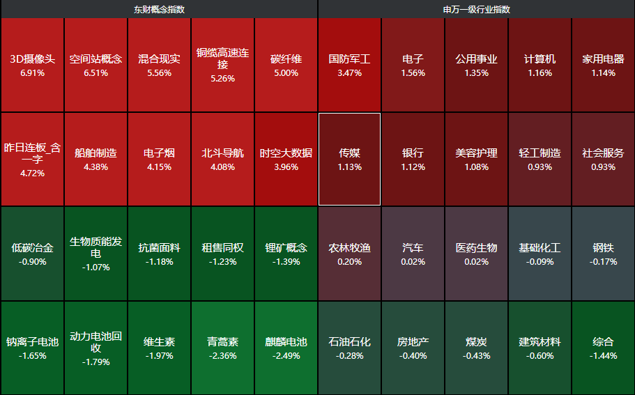 分行业来看,国防军工、电子、公用事业、计算机、家用电器等行业领涨,综合、建筑材料、煤炭等行业下跌。