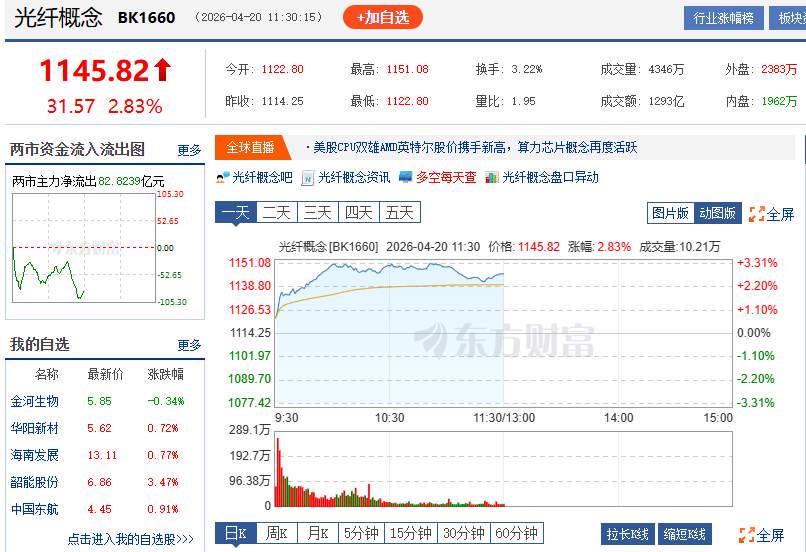 中新经纬4月20日电 (宋亚芬)4月20日,光纤概念股再次爆发。截至上午11时30分,光纤概念(BK1660)板块指数报1145.82点,盘中涨幅最高超3%。