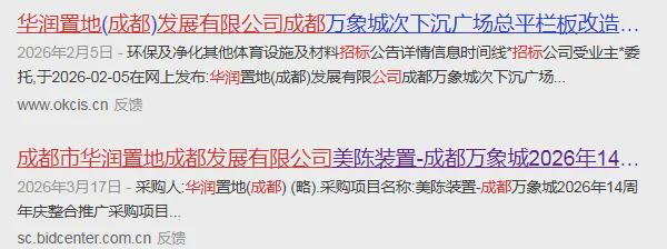 据多个权威招标平台披露,今年3月份,华润置地(成都)正发展有限公司正在为成都万象城2026年14周年庆整合推广采购项目公开发标等。