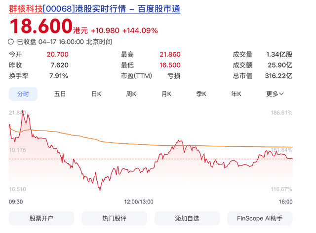 4月17日,群核科技(00068.HK)在港交所挂牌上市,首日高开171.65%,收盘涨幅定格在144.09%,报18.6港元/股,市值约316亿港元。