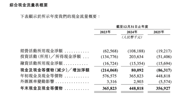 更值得关注的是经营现金流。2023年至2025年,公司经营活动产生的现金流量净额连续三年为负,分别为-0.63亿元、-1.08亿元和-0.19亿元。也就是说,即便2025年实现了经调整净利润的正增长,公司仍未能从主营经营中获得正向的现金净流入。