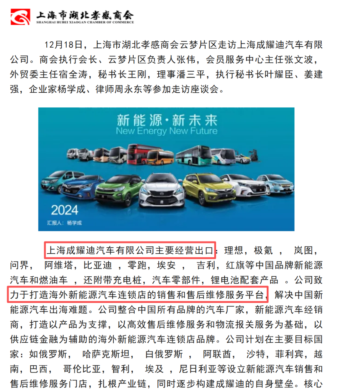 搜了下资料,目前网上对这家 “车企” 的描述可以说是寥寥无几,在湖北孝感商会的一篇介绍中,里面描述成耀迪最开始是干汽车出口的,也会干一点新能源汽车的海外维修。