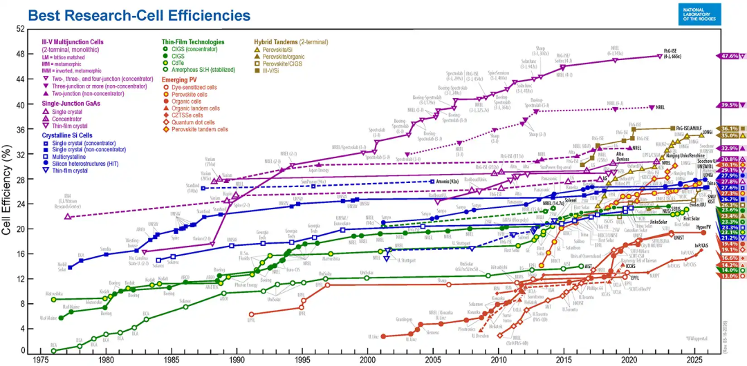 美国国家可再生能源实验室每年都会发布目前太阳能电池最高效率的折线图,实验室条件下都很难干出超过 40% 的转换效率