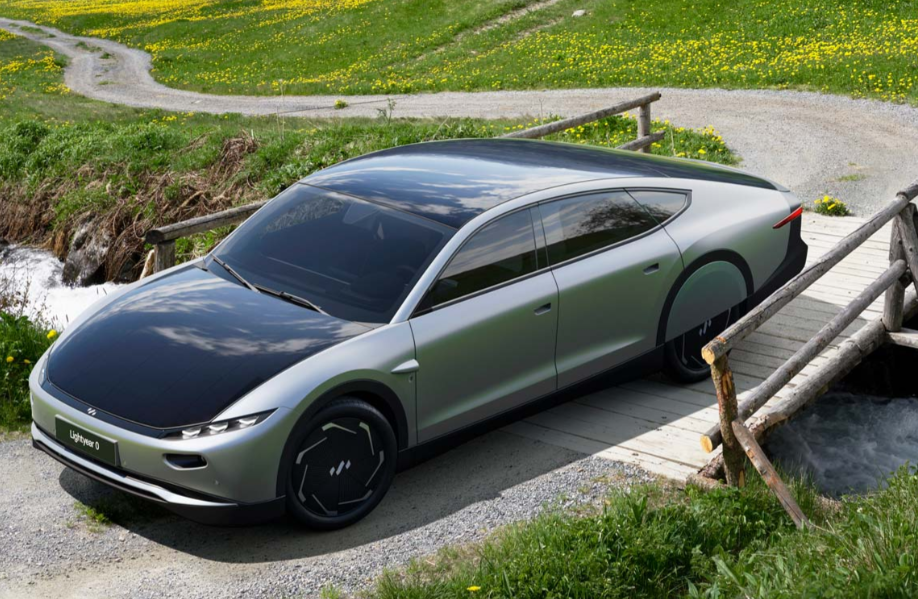这车叫 Lightyear 0,是全球第一辆量产的太阳能汽车,为了美观侧面没贴 “牛皮藓”,太阳能板安装在了前舱盖、车顶、溜背上,面积是 5m³,户外停一天能补充 70km 续航。