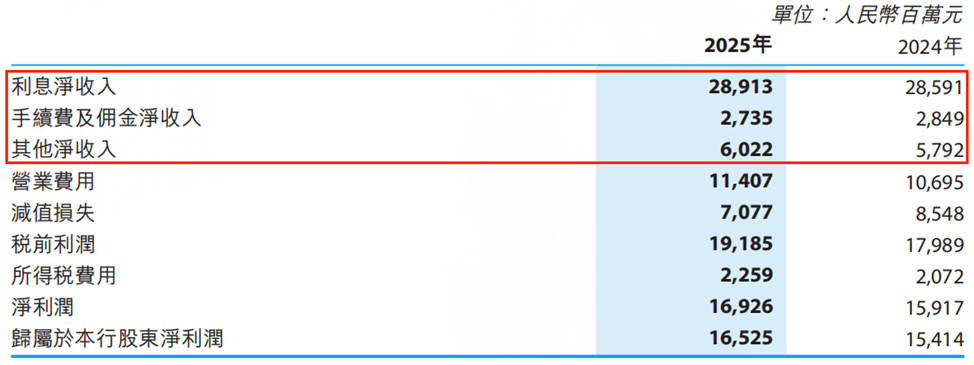 中间业务上,其手续费及佣金净收入表现也并不好,面临下滑压力,2025年录得27.35亿元,同比下降4%,在营收中的占比也从2021年的12.41%下降到2025年末的7.26%。