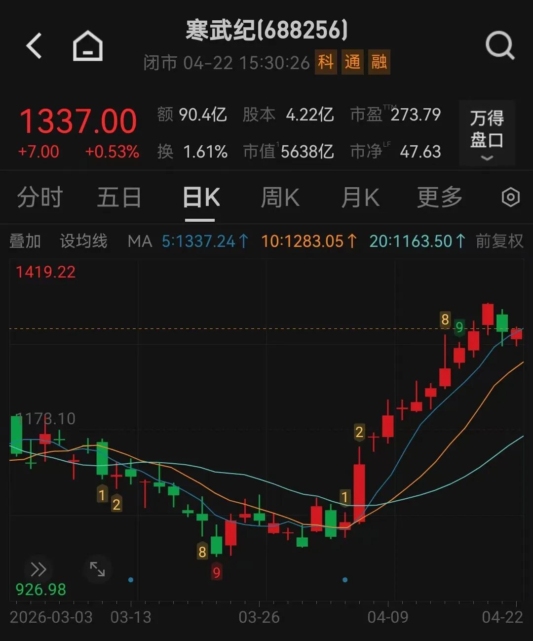 4月22日,寒武纪(688256.SH)股价涨0.53%,4月以来股价已累计上涨36.01%,市值上涨近1200亿元。近期市场有传言称DeepSeek与寒武纪等国内AI芯片厂商密切合作,DeepSeek-V4将基于国产AI芯片完成优化。