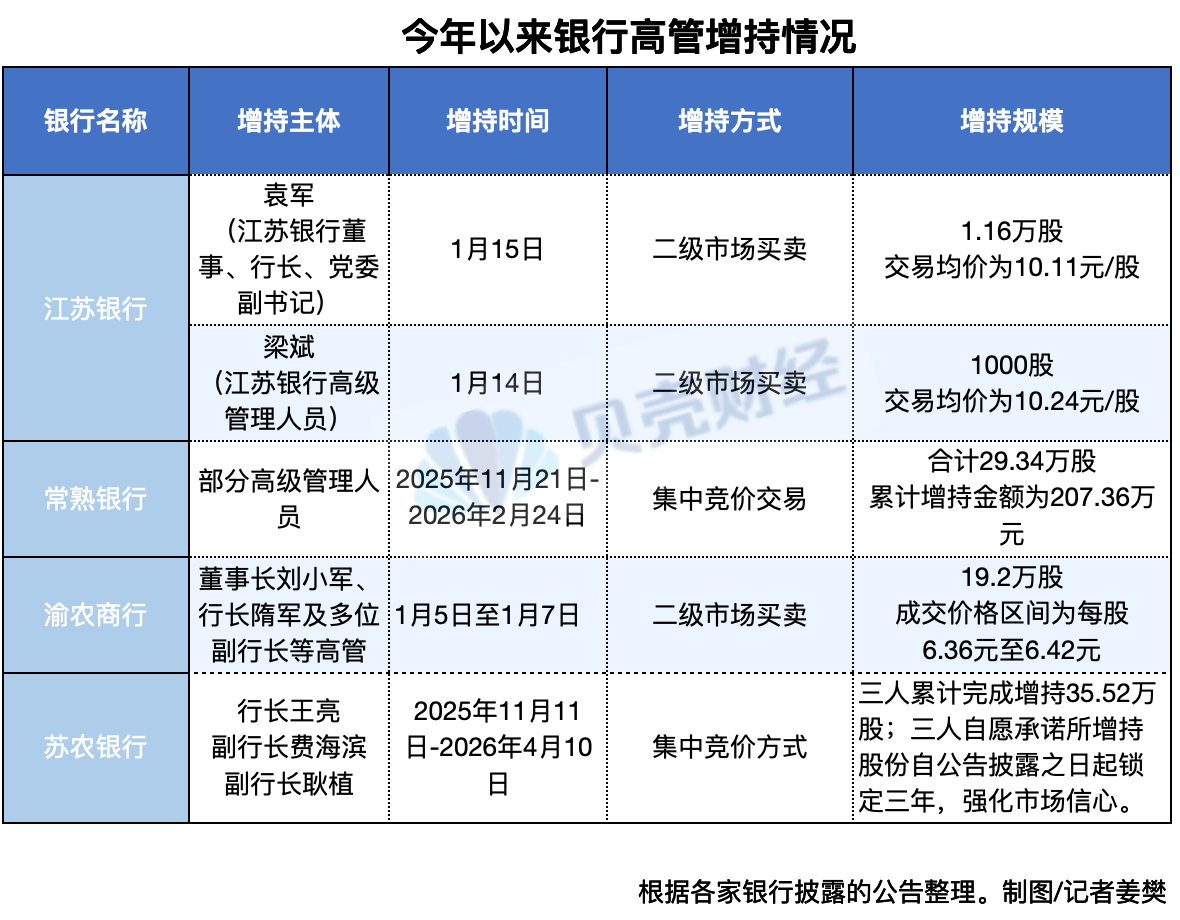 而在今年年初,江苏银行、常熟银行、渝农商行亦披露了部分高管“自掏腰包”增持自家银行股的情况。据贝壳财经记者不完全统计,4家银行高管增持金额共计超过了525万元。