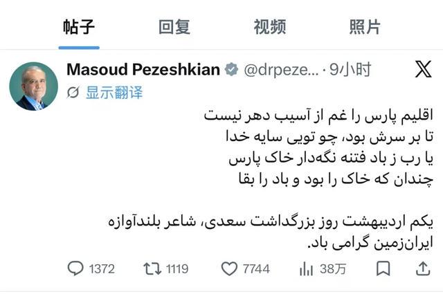 伊朗总统佩泽希齐扬在社交平台引用的一首诗