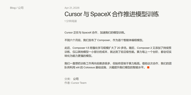 SpaceX拿出的是旗下Colossus超算集群,Cursor拿出是他们的产品化能力。