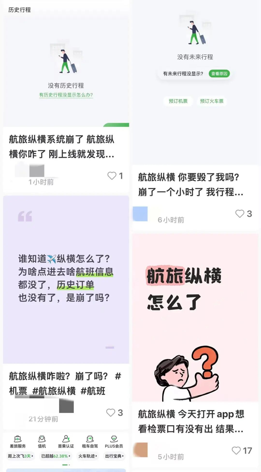 “航旅纵横崩了?我的行程全消失了……”经常出差往返各地的商务人士小娜(化名)今日在朋友圈发出疑问,她的“吐槽”迅速引发广泛共鸣。