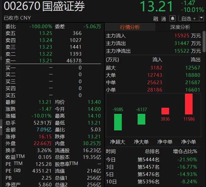 业绩利空消息持续发酵,直接传导至二级市场。4月21日,国盛证券股价开盘后快速下探,最终以跌停收盘,报13.21元/股,最新市值缩水至256亿元。