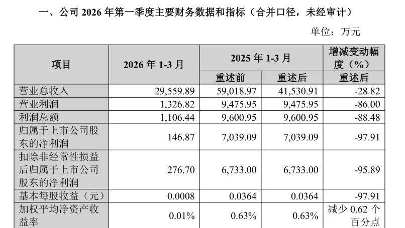4月20日,国盛证券发布2026年第一季度业绩快报。数据显示,公司一季度实现营业收入2.96亿元,同比下降28.82%;利润总额1106.44万元,同比下降88.48%;归属于上市公司股东的净利润为146.87万元,同比下降97.91%。