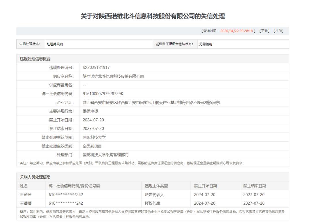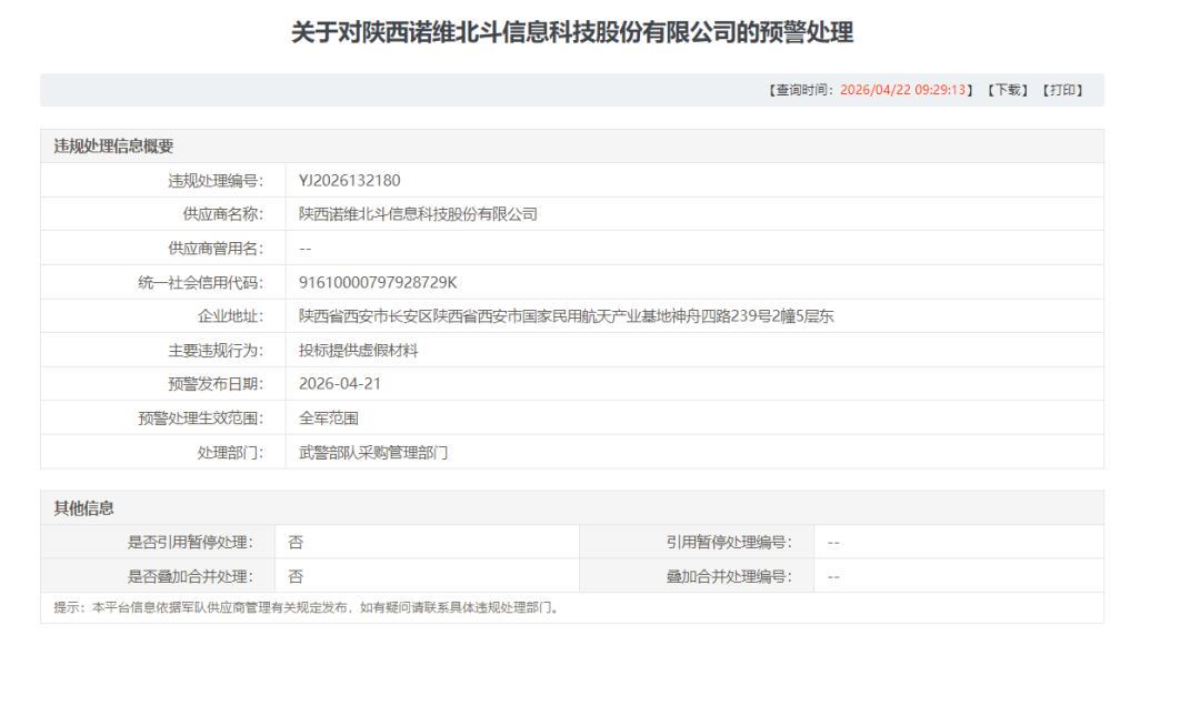 2026 年 4 月 21 日,军队采购网发布官方预警公告,陕西诺维北斗信息科技股份有限公司因招投标违规被公示处罚,企业及相关负责人均被予以书面警告,再次为军工配套企业招投标合规敲响警钟。