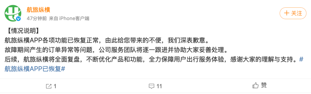 4月22日一早,航旅纵横发文称,“航旅纵横APP各项功能已恢复正常,由此给您带来的不便,我们深表歉意。故障期间产生的订单异常等问题,公司服务团队将逐一跟进并协助大家妥善处理。后续,航旅纵横将全面复盘,不断优化产品和功能,全力保障用户出行服务体验,感谢大家的理解与支持。”