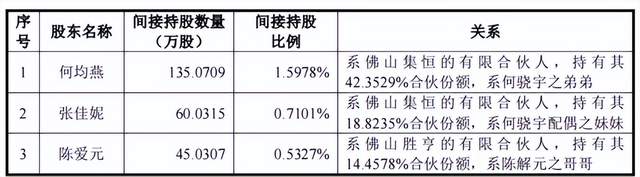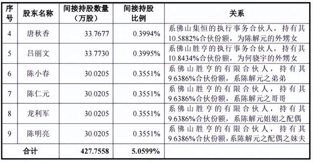 陈解元有6位亲属,两位哥哥陈爱元、陈仁元分别为模具部经理和后勤部主管,间接持股0.53%、0.36%;弟弟陈小春为模具部主管,间接持股0.36%;外甥女唐秋香为制造中心高级经理,间接持股0.4%;姐姐的配偶龙利军为研发中心样品主管,间接持股0.36%;配偶的妹夫陈明亮为车间主管,间接持股0.36%。合计持股2.35%。
